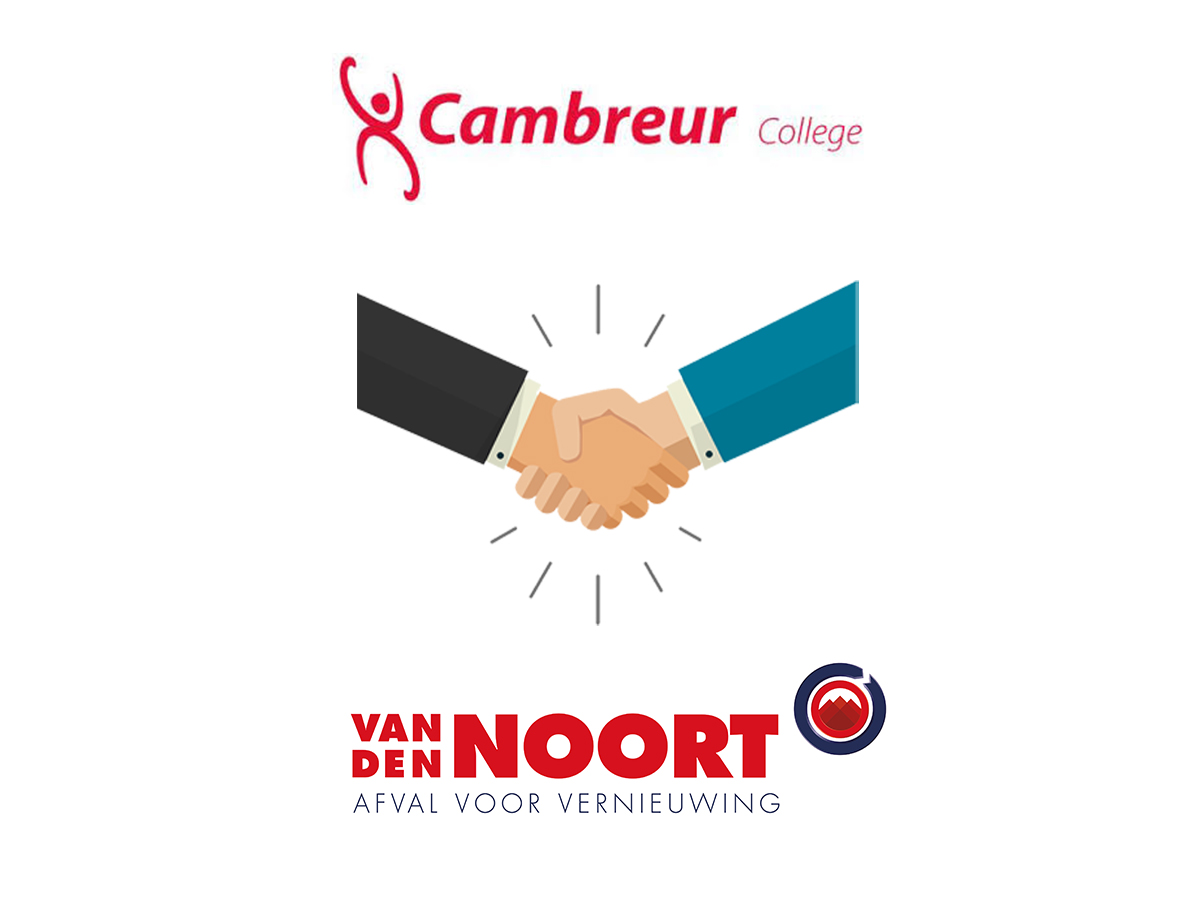 Vanaf 2014 start het Cambreur College op 'gebouw A' met het gescheiden inzamelen van afval. In de aula van gebouw A verschijnen grote automaten waarmee plastic pet-flessen en blikjes ingezameld worden. Daarnaast zal ook het overige afval in de aula voortaan gescheiden ingezameld worden. Wij (Van den Noort) zullen het afval vervolgens ophalen en verwerken. De opbrengst van het gescheiden ingezamelde afval komen deels ten goede aan de leerlingen zelf. Leerling vereniging C.I.A. mag een deel van de opbrengst investeren in de schoolfeesten op het Cambreur! Daarnaast zijn wij beschikbaar voor het geven van gastlessen over duurzaamheid en worden leerlingen in de gelegenheid gesteld een kijkje te nemen bij ons bedrijf.
