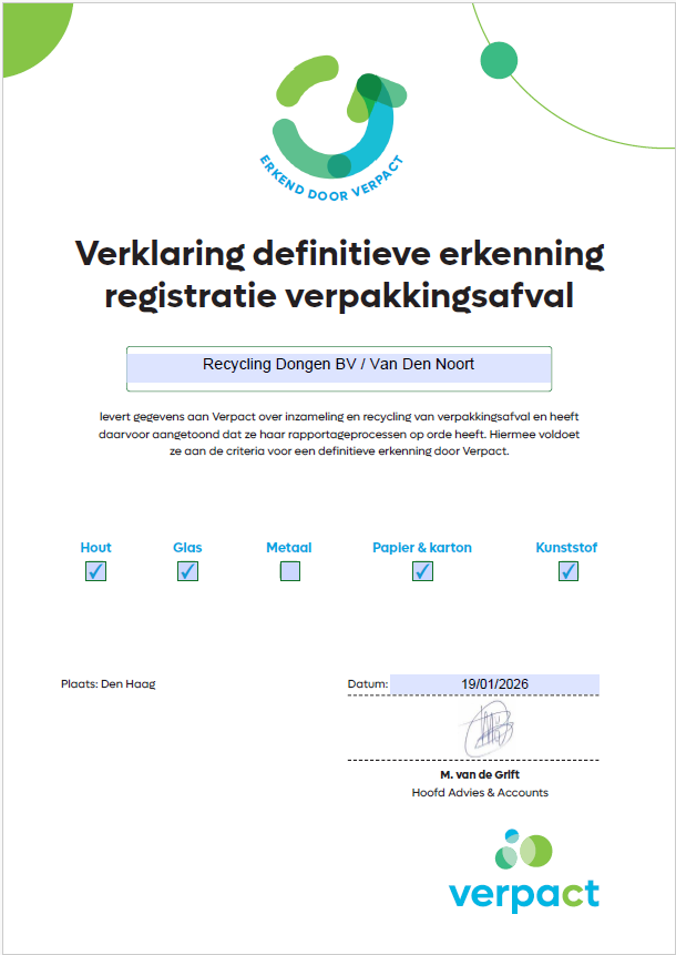 Op maandag 26 januari jl. heeft Van den Noort de verklaring van Verpact ontvangen voor de registratie van ons verpakkingsafval. Met deze verklaring is bevestigd dat wij als bedrijf voldoen aan de wettelijke verplichtingen rondom de registratie en verwerking van verpakkingsafval.